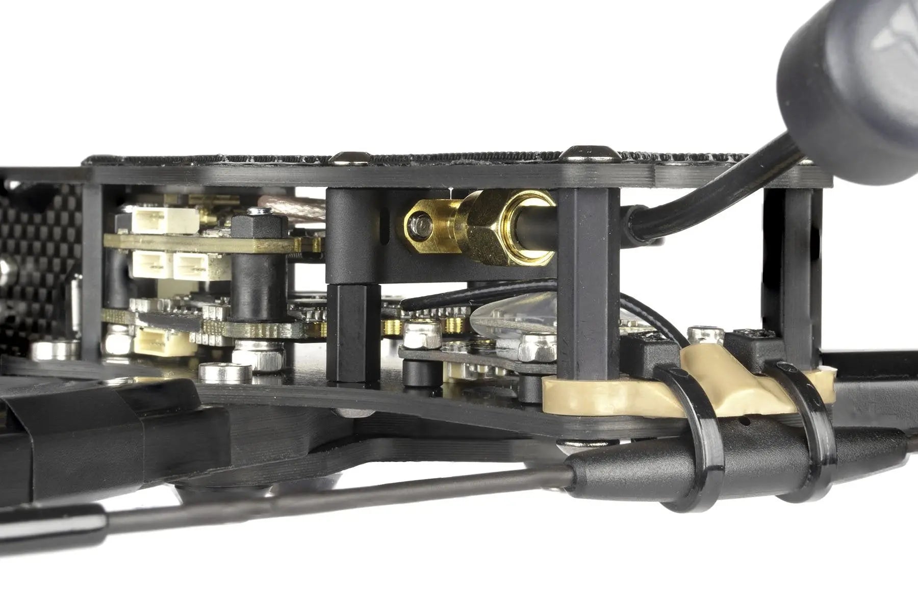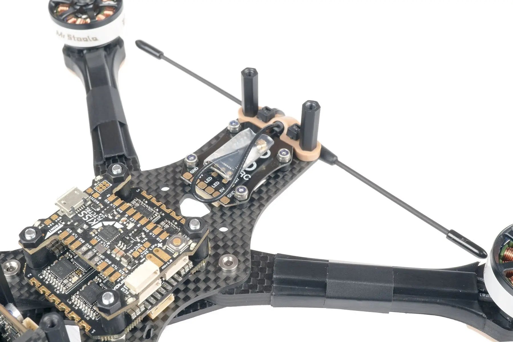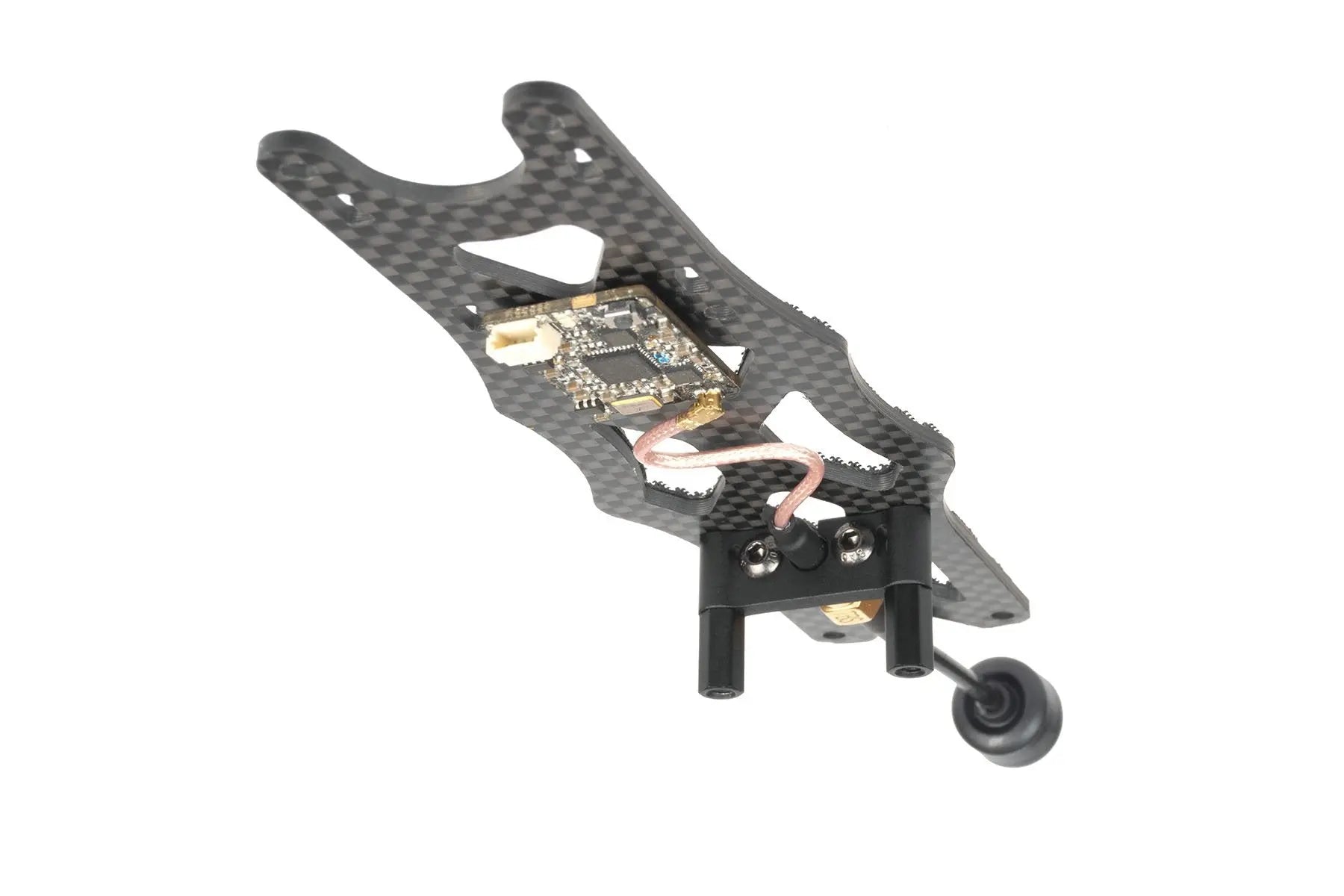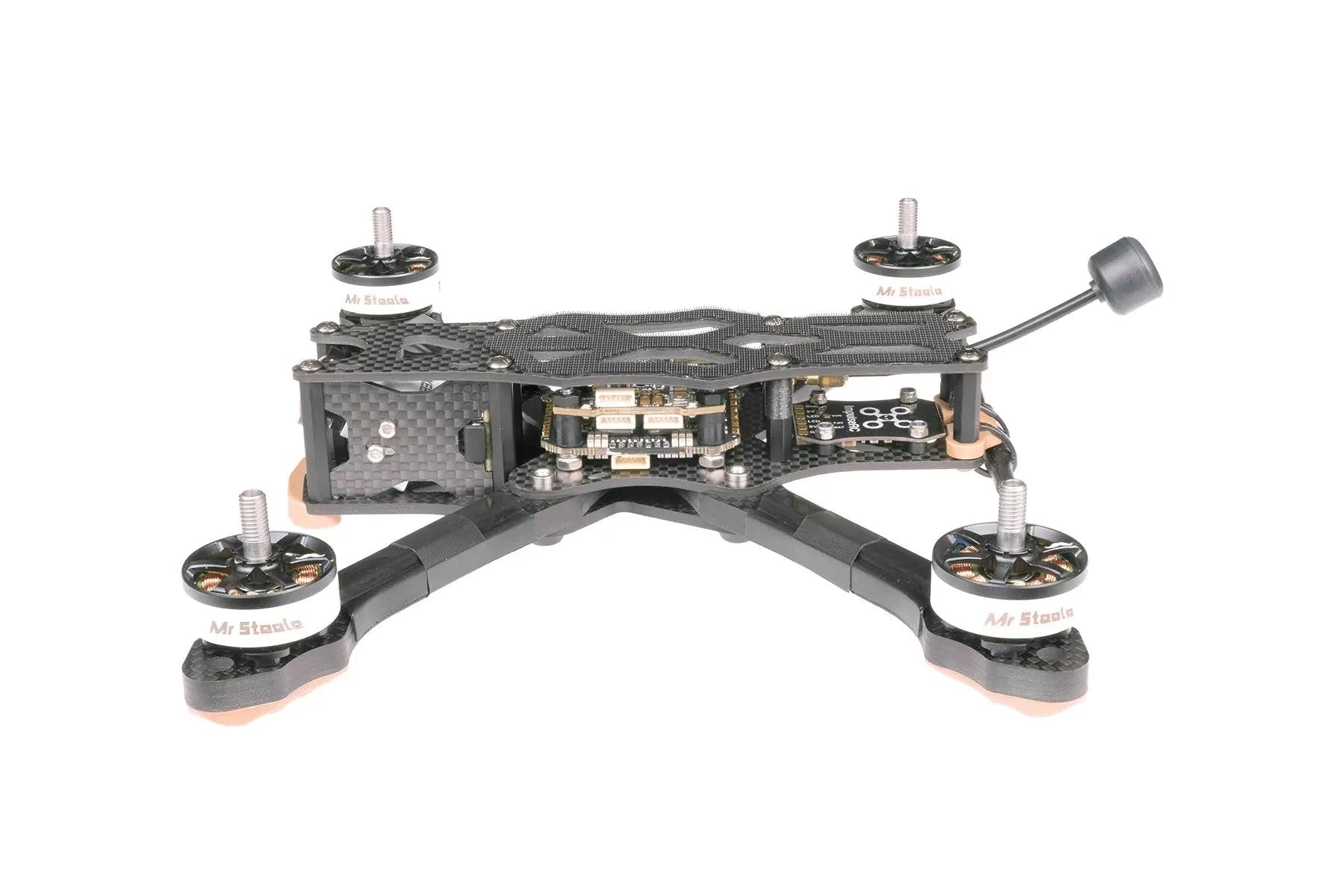 L'elettronica di volo è montata sulla piastra principale superiore mediante bulloni a testa svasata. Questo disaccoppia completamente l'attacco del braccio dal montaggio dell'elettronica. I bracci possono essere sostituiti usando due bulloni senza alcun disturbo al tuo stack.